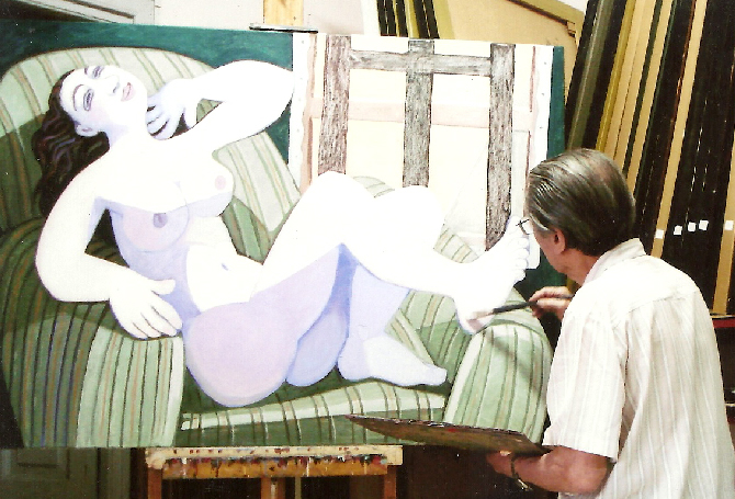 Su pintura, figurativa, partía de la realidad y de la figura humana, sobre todo femenina, pero paulatinamente se alejaba de ella al agregar elementos abstractos y cubistas (luces marcadas, la simplificación y fragmentación de las figuras y el uso del plano tanto en figuras como en fondos).
